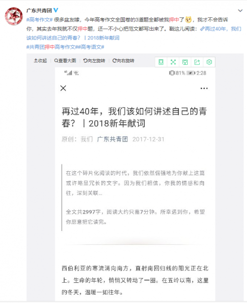 还有更厉害的!@广东共青团“不仅今年押中了题,去年也押中了,还一不小心把范文都写出来了。”
