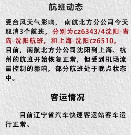 中央气象台11日18时发布台风黄色预警,沈阳今起将受影响,全市各旅游景区8月11日起临时关闭,辖区内民办教育机构于11日-14日期间停课,正在上课的培训机构于11日14时停课,多趟列车停运。