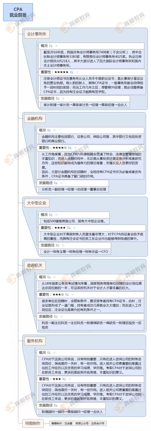 虽然两种注册会计师工作内容相差很大,但是执业和非执业会员的身份是可以相互转化的。 如果非执业会员想到会计师事务所执业,满足一定条件之后,可以从非执业会员申请注册成为执业会员。 如果不想继续在事务所工作,而是去到企业从事审计之外的工作,这时就应该从执业会员转为非执业会员。 其实执业注册会计师和非执业注册会计师之间,并没有孰轻孰重之分,主要还是看每个人的职业喜好以及发展规划。 拿下CPA,成为注册会计师 走遍天下都不怕! 但不管是成为执业还是非执业,只要是拿到了CPA证书,对于个人的专业发展都是不可估量的!以前是拿下数理化走遍天下都不怕,现在则是拿下CPA成为注册会计师,天下任你闯! 高顿教育小编用一张思维导图给大家整理了一下,CPA持证人的就业前景,真的很宽广: