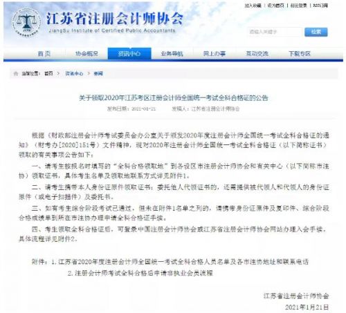 说正事!近日,注协正式官宣:给参加了2020年CPA考试的考生正式开始发放证书! 而对于即将拿到2021年第一批CPA证书的考生来说,接下来就是成为一名自带光环的注册会计师,在奥迪特等岗位上熠熠生辉了! PS:为了帮助大家在2021年实现目标,高顿教育小编收集了2021年CPA考试的时间表,涵盖12个月的重大节点,现在直接给到大家,有需要的,抓紧时间: 注协最新官宣: 2021年第一批CPA考试证书开始领取! 近日,多地注协都发布了CPA考试证书领取通知,对于参加2020年CPA考试的伙伴来说,这无疑是个好消息! 先看最新昨天江苏省注协发布的《关于领取2020年江苏考区注册会计师全国统一考试全科合格证的公告》,通知CPA考生们过了六科和综合阶段的可以领取证书了: