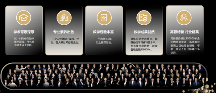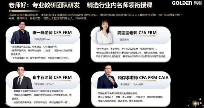 专业是教育的立身之本,高顿教育始终将教研与师资建设作为核心竞争力,以专业筑牢 CFA 培训的根基。在师资层面,打造了一支 “双证加持、实战兼备” 的教学团队,授课教师均同时持有 CFA 与 FRM 双证书,83% 拥有海外留学深造背景,75% 具备硕士及以上学历,平均教学经验超五年,更有陈一磊、崔中石、文骏程等行业知名讲师坐镇,他们兼具深厚的学术功底与金融机构核心岗位实务经验,既能精准拆解考纲考点,又能结合资本市场实操案例让理论知识落地。同时,高顿组建了近百人的专业教研团队,持续跟踪 CFA 协会考纲动态,深度研究考试命题规律,自主研发适配华人考生的学习资料,从知识框架图、核心公式手册到高频考点总结,全方位为学员备考保驾护航。