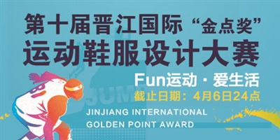 今日24时,作为第十八届中国(晋江)国际鞋业(体育产业)博览会的配套赛事,以“Fun运动·爱生活”为主题的第十届晋江国际“金点奖”运动鞋服设计大赛最终截稿,届时赛事平台将停止稿件上传功能(http://xl2016.cfw.cn/)。