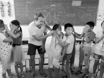 在英语国际夏令营里,外教和西滨中心小学的孩子们一起做游戏。(资料图片)