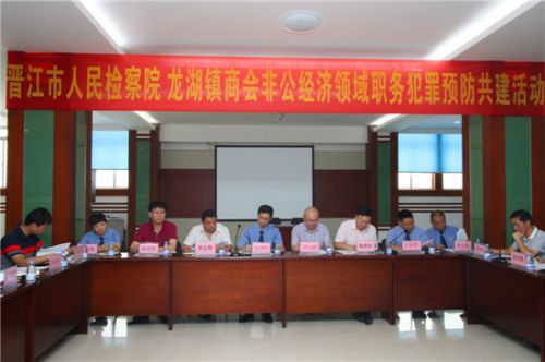 8月12日,晋江市龙湖镇商会会长粘为江从该市检察院代理检察长甘泽阳的手中接过了“预防职务犯罪联系点”的牌子,这意味着龙湖镇商会正式成为该院在民营企业和行业协会中设立的第12个预防联系点。