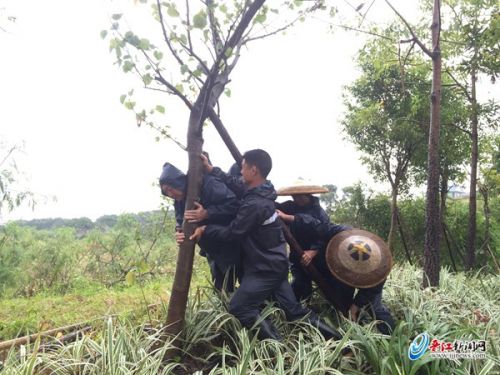 昨日下午4点多,雨势突然变大,陈埭鞋都路上,每隔一段,就能看到园林工人在扶起倒伏的树木。晋江市市政园林局绿化养护技术人员蔡经轮就在其中,仔细观察,会发现老蔡的动作虽然娴熟,脚上的功夫却似乎不那么利索。