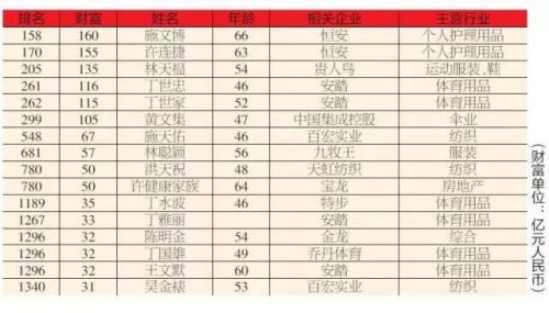 公司方面公司方面,安踏、恒安、百宏实业3家公司出现了多位上榜富豪。值得一提的是,其中有4位来自安踏,占上榜晋江商人的1/4。