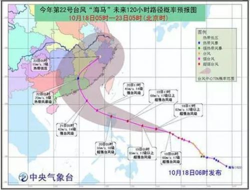 预计,“海马”将以每小时25公里左右的速度向西偏北方向移动,最强可达超强台风级(60~65米/秒,17级或17级以上),并将于20日下午移入南海东北部海域,之后逐渐向广东东部到福建南部沿海靠近,并可能于21日下午到夜间在这一带沿海登陆。