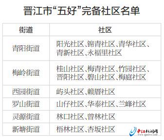 据悉,晋江今年共确定青阳街道、梅岭街道等6个街道的20个社区,按照“环境好、配套好、治安好、服务好、文明好”内容要求,进行“五好”完备社区创建。