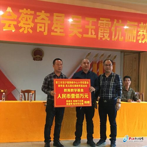 据了解,成立教育基金会,为家乡教育公益事业做奉献,一直是蔡奇星、吴玉霞伉俪多年来的愿望,这也得到了儿子的支持,他们分别是福建百佳(内衣)有限公司董事长蔡建忠和晋江市晶然彩印公司董事长蔡建明。据了解,蔡奇星、吴玉霞伉俪对家乡的公益教育事业非常热心,早在2004年,他们就捐资12万元用于狮峰中心小学新校舍建设。2015年,蔡建忠秉承父辈热心家乡公益事业的精神,也捐资10万元支持狮峰社区田螺山公园篮球场等基础设施建设。