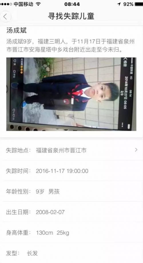 “9岁男孩,身高140厘米左右,昨晚19:30左右在安海家里被12岁的同伴叫出门,二人至今未归,走时身穿黑色夹克,豹纹裤子,家人万分着急”,今天一大早,这条紧急寻人启事在晋江市民的微信朋友圈中转发,一场牵动众人的寻人行动在网上悄然进行。