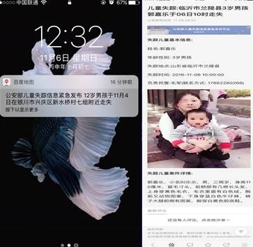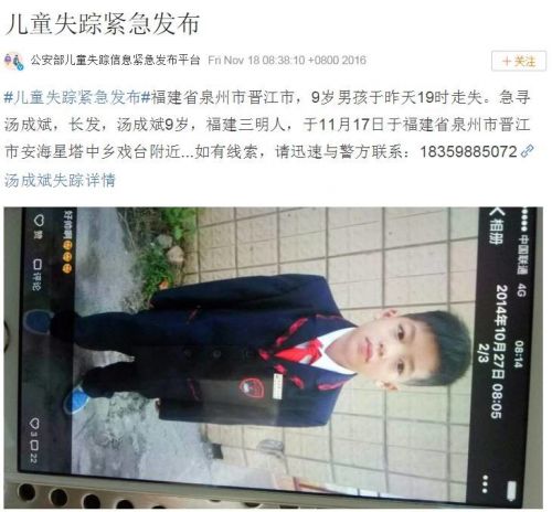 孩子走失的信息今天早上还在《公安部儿童失踪紧急发布平台》上转发,引起国内热心网友关注。