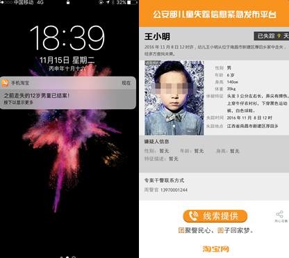 (手机淘宝客户端失踪儿童信息推送示意图)