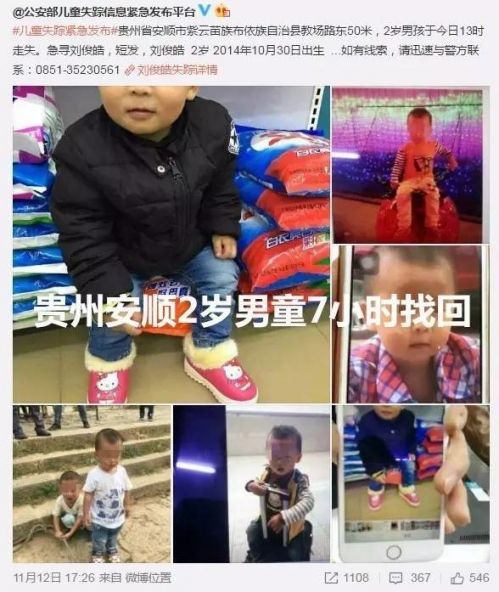 2016年11月12日,公安部儿童失踪信息紧急发布平台官方微博发出了2岁贵州男童刘俊皓被找到的消息。这距离官方发布小俊皓走失信息仅过去了7小时。