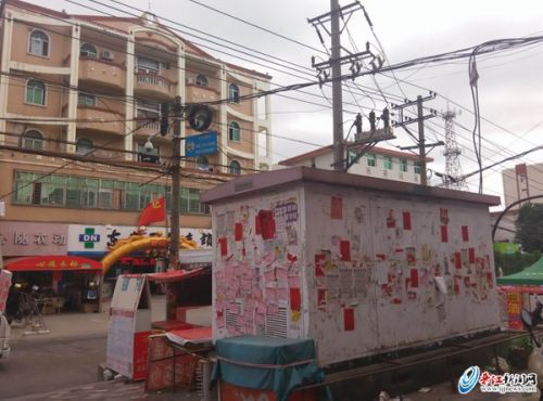 招聘、出租、家政服务……池店镇龙池路蓝宇快餐店前的两个变电箱上,张贴着五花八门的小广告。这些小广告像“牛皮癣”一样,大多使用不干胶等材料,使原来洁净的变电箱面目全非。