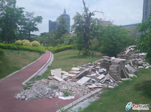 日前,记者在晋阳湖靠双龙路一侧的环湖慢行道边看到,一大堆建筑垃圾堆放在绿化带上,这与周边环境格格不入。