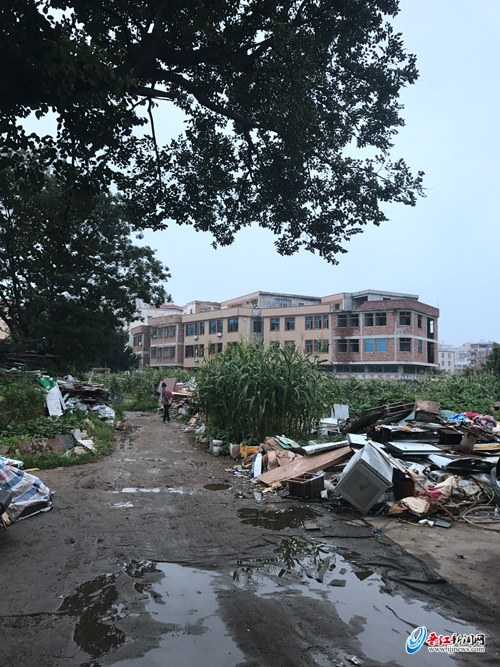 一条空旷的满是“伤痕”的泥土路上停了不少私家车,路旁堆放着建筑垃圾。沿着泥路往里走,避开几个大大小小的污水坑后,几间用木板、砖瓦搭建起来的平房映入眼帘。更令人吃惊的是,平房外的空地被大堆大堆的杂物和大片大片的菜地占据着。