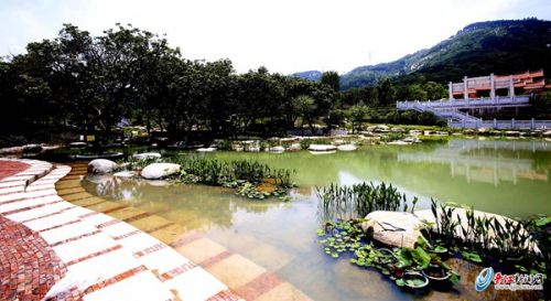 透过墙体镂空处向前看,是一大片景观湖。记者了解到,该景观湖约3000平方米,把整个公园水系贯通起来,湖里生长着睡莲、荷花等植物,还有各种叠石“镶嵌”在湖面上,好似从水里探出来的“石头小径”。