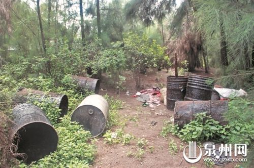 遗留在现场的一些铁桶满是油污