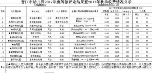 昨日,晋江市教育局对2017年秋季全市公办、民办幼儿园收费标准进行公示。