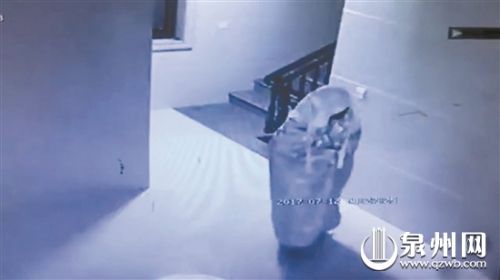 调取监控视频时,民警眼前出现了既惊悚又搞笑的一幕。7月14日凌晨2时55分许,柯先生家对准一楼通道的探头突然被顶歪。