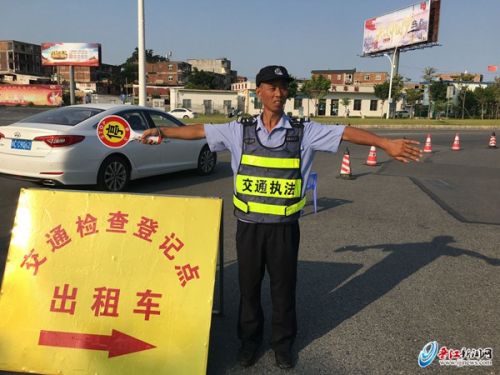 下午5点,动车站检查点,一名晒得黢黑的执法人员,正在路面指挥出租车停靠到检查点,尽管汗如雨下,但他却不漏掉一辆出租车。