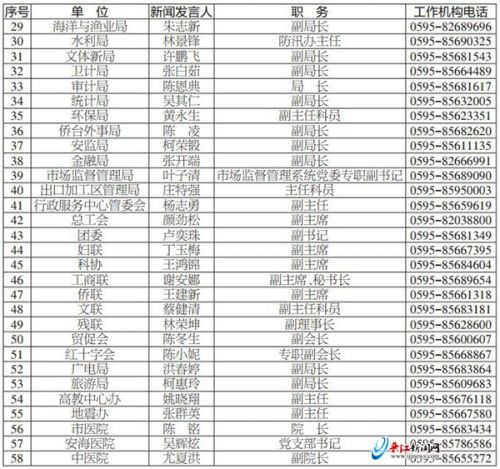 晋江市部分市直单位和镇(街道、经济开发区)新闻发言人名单及新闻发布工作机构电话