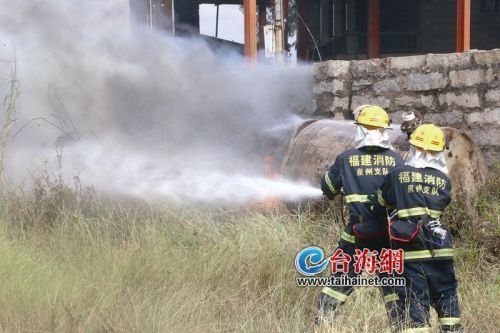 接警后,晋江消防大队陈村中队立即赶到现场,只见两个小型罐体在猛烈地燃烧着,空气中飘散着一股刺激性味道,而附近不远处就是一所小学,如不及时处置,后果不堪设想。