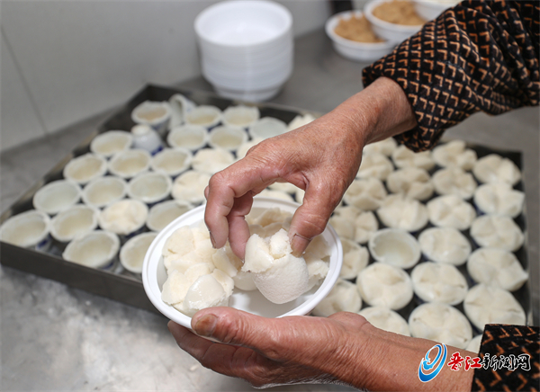“好了好了,这一炉可以出炉啦。”林花片母女俩将蒸炉中一盘盘的碗糕转移到案板上,刚刚出炉的碗糕在小小的瓷碗里绽放出一朵三瓣的花来,“我们说这是碗糕‘笑了’,如果做出来碗糕没有‘笑’,那就失败了。”林花片说,闽南有句俗语:煎粿蒸糕发新年。因为制作碗糕需经过发酵,便取其“发”的寓意,代表着发达、发家致富等,寄托着人们的美好愿望。另外,发酵过程把握得好,蒸时火候控制得当,碗糕的顶部就会像开花一样,又像“笑脸”,象征了喜乐。“虽然做这个很辛苦,但是每天看碗糕‘笑’,我也跟着开心。”林花片说道。