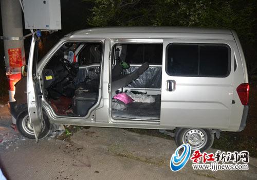 晋江交管龙湖中队民警接警赶到现场,只见面包车车头顶在电线杆上,已严重凹陷,司机是名30多岁的男子,坐在车内,头部受伤,车内还留有一些血迹和呕吐物。