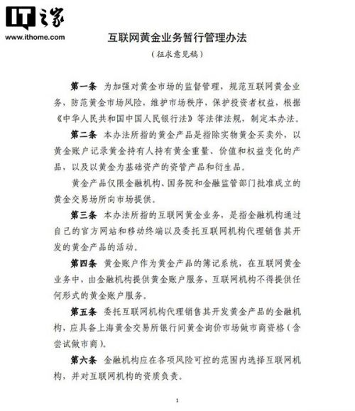 《办法》指出,互联网机构对其代理销售金融机构的黄金产品,可提供产品展示服务,不得提供黄金清算、结算、交割等服务,不得提供黄金产品的转让服务,不得将代理的产品转给其他机构进行二级或多级代理。