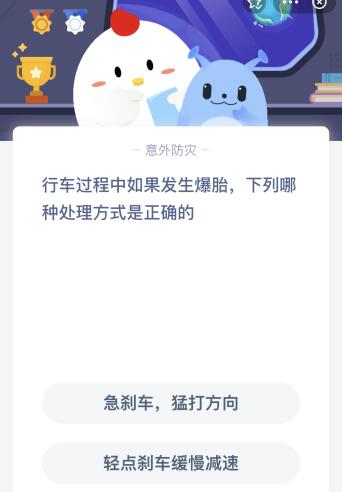 行车过程中如果发生爆胎,下列哪种处理方式是正确的?这是2022年蚂蚁庄园4月8号今日庄园小课堂的问题,下面为大家详细介绍2022年4月8日今天蚂蚁庄园课堂小鸡饲料答案。