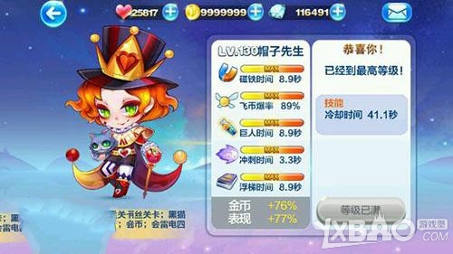 满级130级、磁铁时间8.9s、飞币爆率89%、巨人时间8.9s、冲刺时间3.3s、浮梯时间8.9s、金币+76%、表现+77%