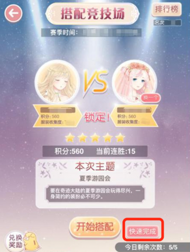 而更新后的竞技场也将变得更加方便,在已经通过一次当前主题的前提下,锁定对手后,点击“快速完成”按钮即可快速过关。每次使用“快速完成”后都需要几秒缓冲时间,大家不要按得太快。版本更新后,【海沫生珠】套装的妆容—女神眷顾也将更换为正确的部件。已经集齐套装的小伙伴可以前往查看啦~