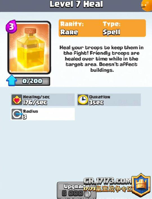 最后是治疗法术。如果你有玩过《部落冲突》的话相信你肯定知道这张法术牌是有多么的爽歪歪。在7级时治疗法术能够每秒带来176点的生命值恢复,一共持续3秒,总计528点。除此之外影响的范围是3格---这样的数值到底是强是弱我们现在也不得而知,毕竟这是游戏加入的第一张能够恢复生命值的卡牌。不过从3费的消耗来看,治疗法术的花费还是有点儿高的。比如狂暴法术同样也是3费,但在游戏中很少有玩家会冒险使用它。而考虑到小电、大电、滚木等法术牌的“常驻”地位,大家是不是有必要再带一张法术牌目前还很难说。