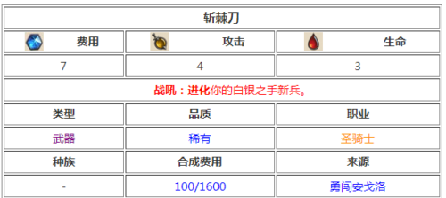 小编点评:7费4-3的武器,就看面板算是很低了,攻击后召唤两个白银新兵,3刀总共6只,算6费,这样算不是很亏费。但是实在太乏力了,用七费来放一把4攻的刀和两只1/1的新兵,相当于把场面让给对手了。除非有什么办法降低费用,否则这把武器难堪重用。