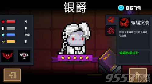由于吸血鬼武器特殊我这里单独讲一下,这个酒杯嘛,暴击就能召唤蝙蝠,对对敌人造成5点伤害,在给你绍点蓝(感动),而且它升级后,就更厉害,还能直接喝(侍者:不是我家的饮料),加一点生命上限。(偷偷告诉你,这些全是吸血鬼专属)。
