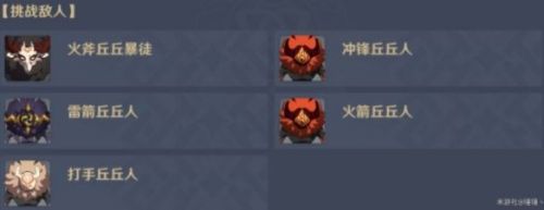 这是一个很简单的关卡;由火斧丘丘暴徒&4种丘丘人组成,时间很充裕,可以直接挑战极限难度。
