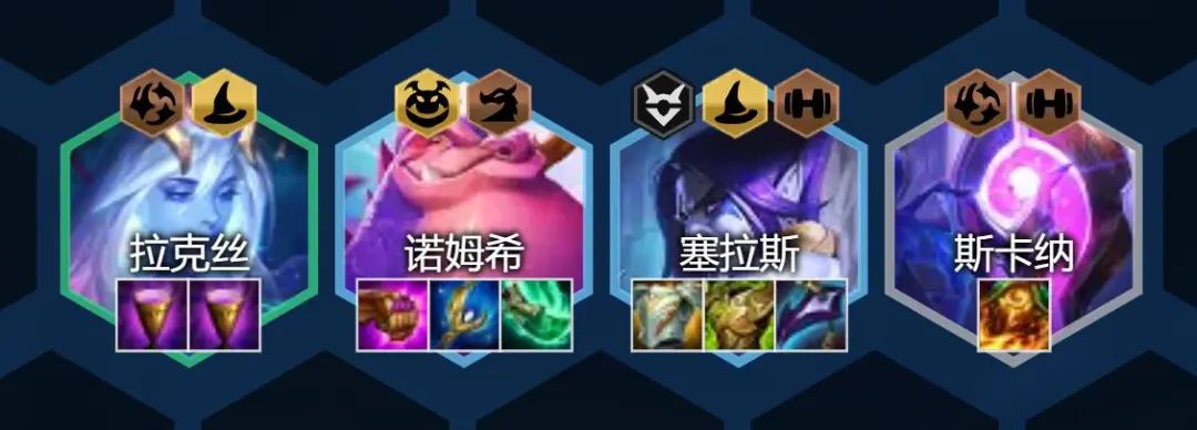 阵容前期主要考虑1-2个圣杯,之后在考虑塞拉斯坦度装备与诺姆希的法系输出装。