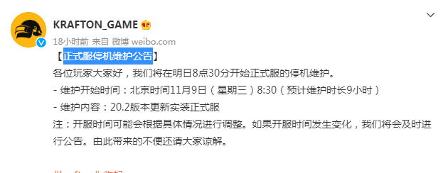 绝地求生停机更新维护公告最新11.9 PUBG绝地求生今天停机更新多久?