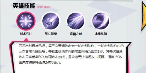 西凉出剑极其迅速,其普攻只享受40%物理攻击加成且不受攻速影响。每3次普攻为1轮击剑动作,每完3轮击剑动作,则会提升1级自身对战斗的专注等级,持续5秒,最多提升3级。战斗专注可以使西凉使用普攻或技能对目标造成的任何伤害提高[+5%物理加成]/[+10%物理加成]/[+20%物理加成]点物理伤害。