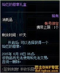 【每日签到】2015年3月26日维护后至4月23日凌晨6:00,Lv30及以上的角色每天通关4次推荐地下城即可领取1个【农夫的每日感谢礼盒 1】。