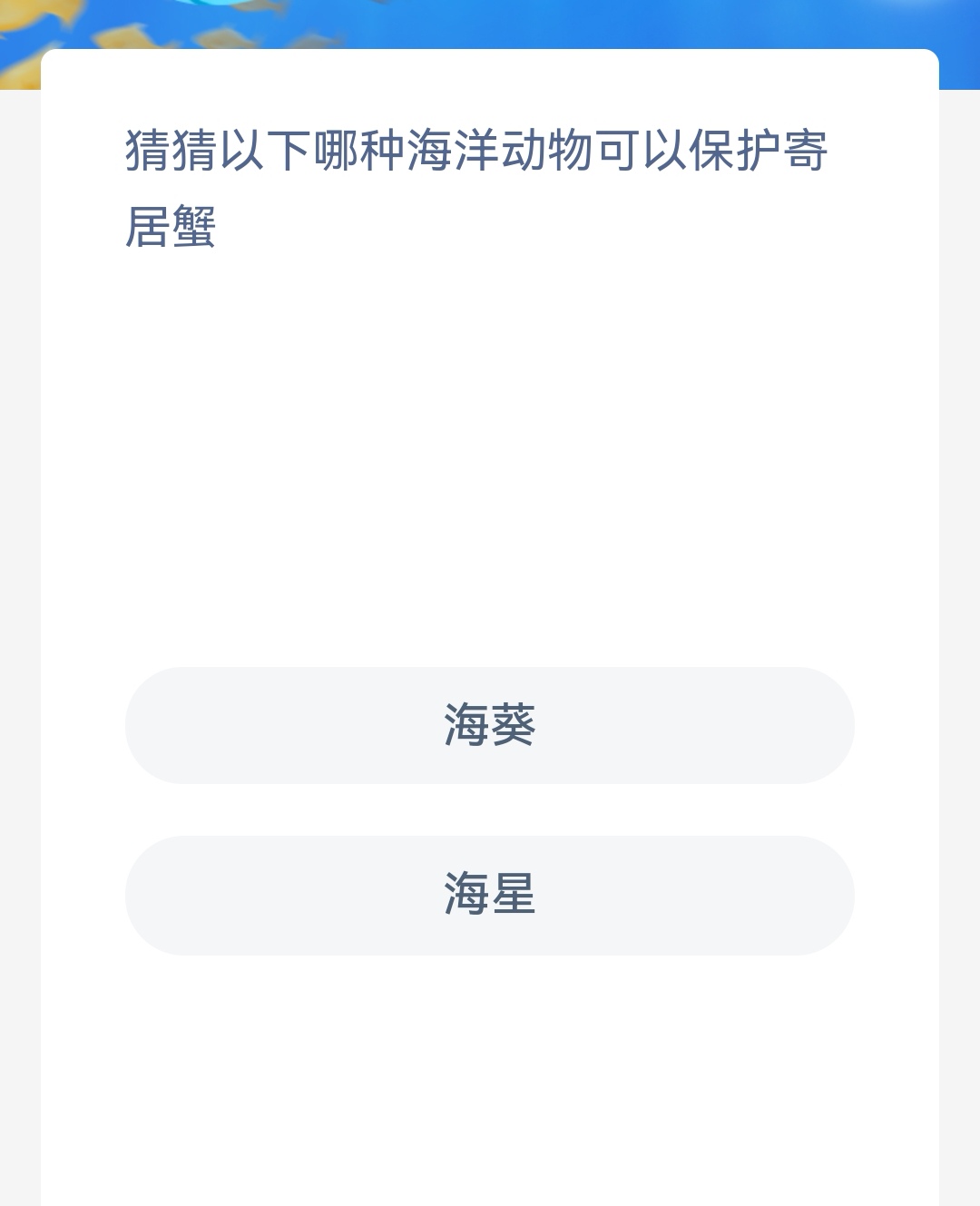 猜猜以下哪种海洋动物可以保护寄居蟹?这是神奇海洋今日答案12.10的问题,答对支付宝蚂蚁森林神奇海洋12月10日的问题即可获得拼图奖励。接下来就让我们一起了解一下神奇海洋12月10日保护寄居蟹的是海葵还是海星的正确答案吧。