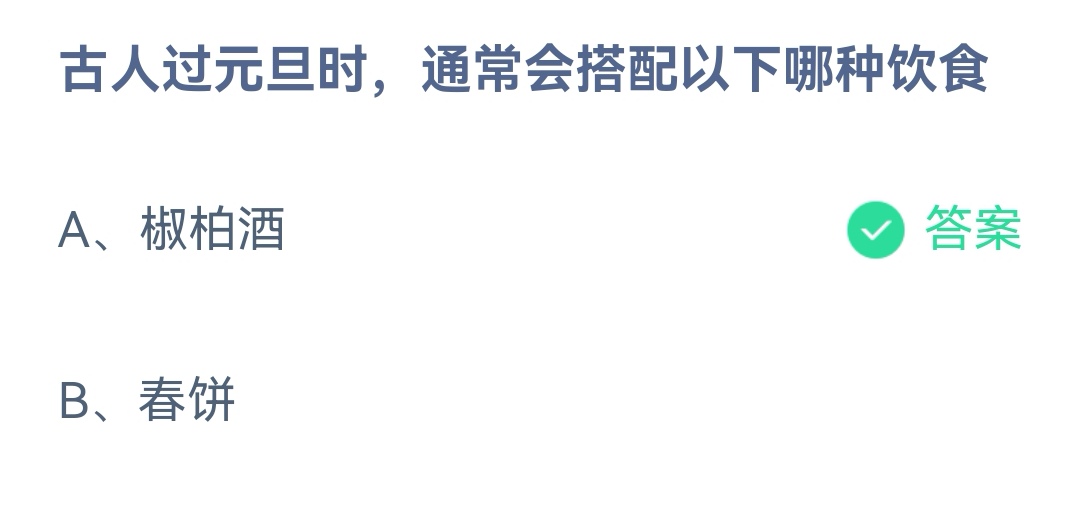 蚂蚁庄园今天答案最新1.1:古人过元旦时通常会搭配春饼还是椒柏酒?