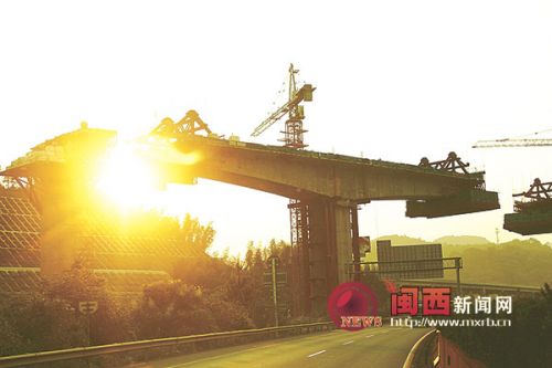 厦蓉高速公路扩建工程龙潭特大桥右线全长1630米,左线全长1592米,是全线控制性工程之一,经过近两年施工基本成形,桥梁上部结构正在加紧架设,即将全面贯通。图为昨日夕阳下火热施工中的龙潭特大桥右线连续梁作业现场。(记者 傅长盛 摄)