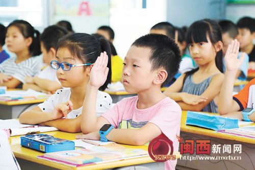 7日,龙岩实验小学一年级(5班)学生、7岁的赖俊宏正举手准备回答老师的问题。