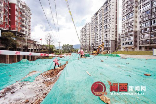 9月10日,龙岩市青竹路(龙腾北路-解放北路)工程施工现场,工人正为路面铺设防尘膜,配合创城迎检工作。下阶段,综合管廓基坑灌注支护桩、土方工程清表、道路改渠等施工将同步进行。据了解,该工程总投资1.8亿元,双向6车道设计,总宽34米,预计2018年7月底建成,届时这条横穿龙岩大道的城市主干道将更好地方便市民出行,使岩城的交通更为顺畅。(记者 陈律全 摄)