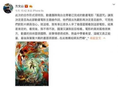 方文微博支持电影《风语咒》 激发新歌创作灵感