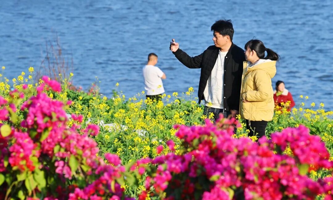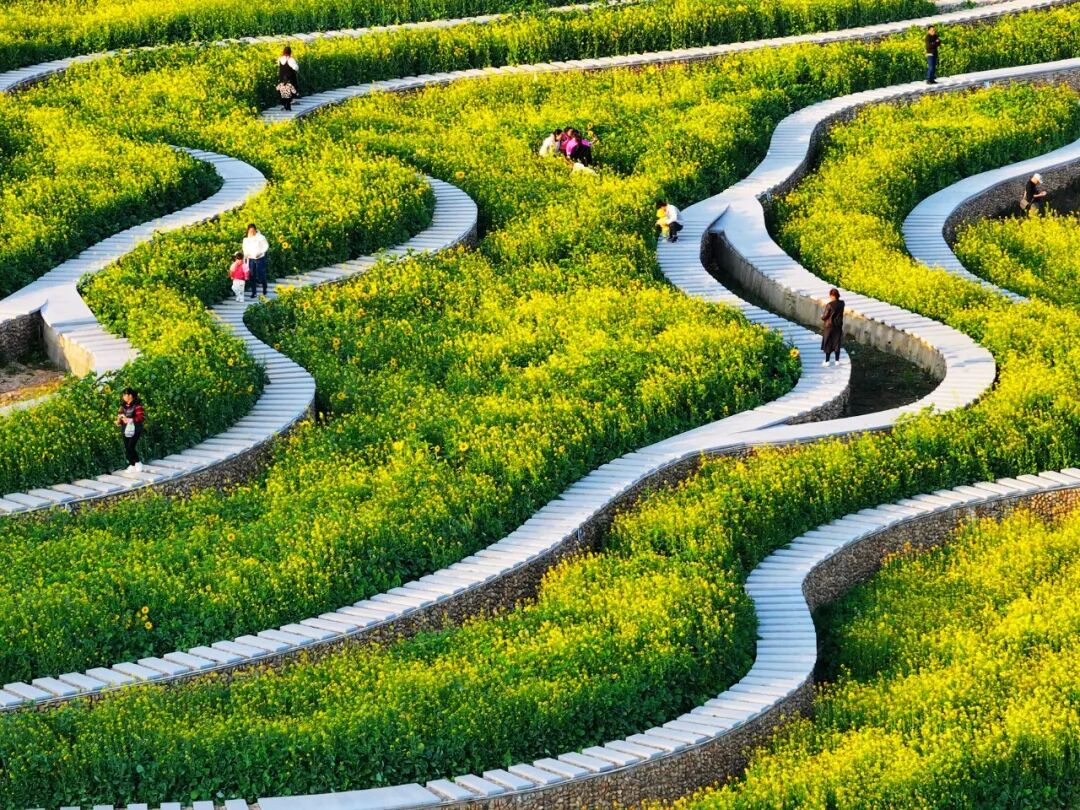 四季不同景的龙峰广场,在春天迎来了多种油菜花的盛开。
