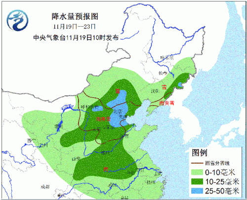 需要注意的是,在强冷空气到来前,东北地区南部、华北等地会一直持续阴雨雪天气。其中,21-23日,内蒙古东部、河北北部、吉林东部的部分地区有暴雪(10~18毫米)。最大积雪深度可达5~20厘米。北京、天津北部、河北中部等地将出现雨或雨夹雪转雪,降水量有10~25毫米,平原地区可能出现5~10厘米积雪、北部山区可达20厘米左右。