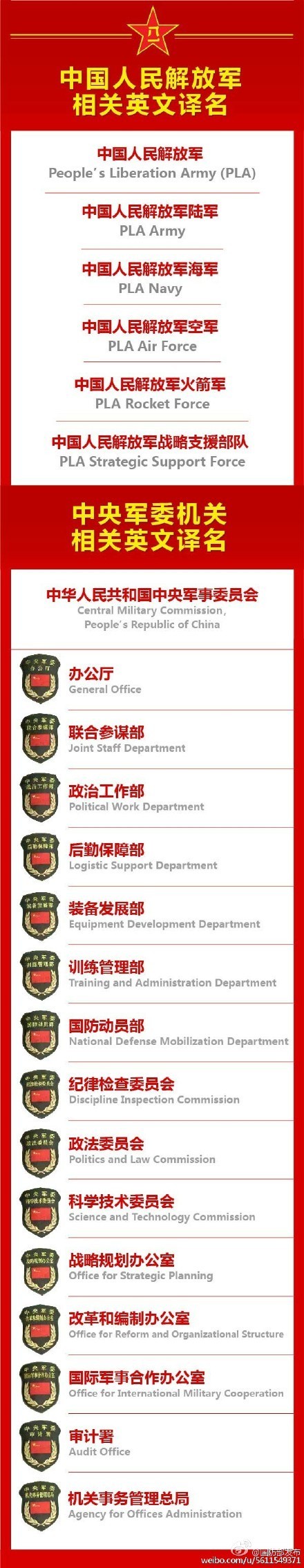 中国人民解放军相关英文译名公布 完整版一览(图)